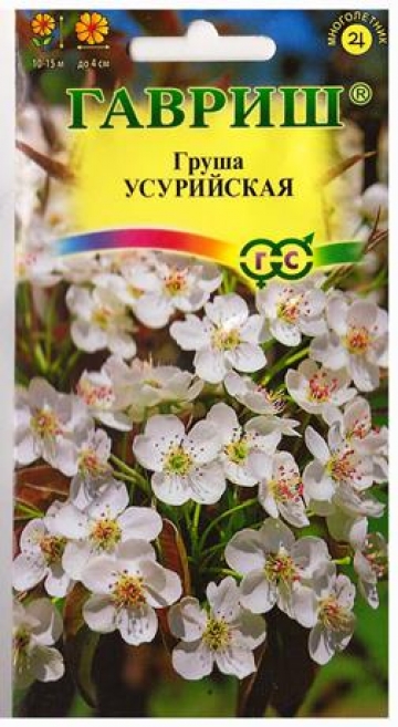 Декоративное дерево со съедобными плодами. Взрослое растение высотой 10-15 м, с густой, широкой кроной в форме пирамиды и темным, практически черным стволом. Листья яйцевидные, плотные, блестящие, темно-зеленые, осенью багряно-красные. Цветки белые, крупные (до 4 см), с сильным запахом, на длинных цветоножках собраны в соцветия по 5-10. Цветет до распускания листьев в течение 5-9 дней. Опыляются пыльцой только другого дерева, чем объясняется отсутствие плодов у одиночно стоящих деревьев. Плоды до 5 см, разнообразные по форме и окраске, с терпкой мякотью. Высокая морозостойкость этого вида делает грушу усурийскую особенно ценной для северных районов России, а относительно небольшие размеры позволяют использовать ее в небольших садах и скверах, в одиночной и групповой посадке, в живых изгородях. Легко размножается семенами. Высевать лучше осенью. Для посева весной семена стратифицируют в течение 2-4 месяцев при температуре 0+5 Комментарии к товару
