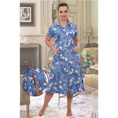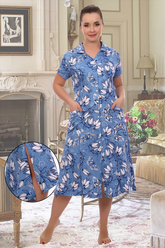 ID товара: 278405 Состав: Хлопок 100% Сезон: Весна/Лето Длина: Ниже колена Фасон: Расклешенный Рукав: Короткий Вид застежки: Пуговицы Декоративные элементы: Печатный принт Основная ткань: Хлопок | Кулирка, Кулирка — это самое тонкое и гладкое трикотажное полотно, изготовленное из чистого хлопка. Полотно имеет характерную структуру- с лицевой стороны плоские «косички», с изнаночной – «кирпичная кладка». Особенности- гигроскопична, воздухопроницаема, при стирке, сушке и глажке не садится, хорошо держит форму, не образует складки. Стиль: Повседневный Страна бренда: Россия Страна производства: Россия Халат женский из ткани кулирка набивка, качество реактив. Халат с воротником, отделка - кант, с карманами, приталенное с рельефами. Низ халата расклешен, по бокам глубокие разрезы, застежка на пуговицы Комментарии к товару