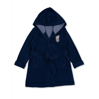 Замечательный махровый халат с капюшоном для мальчика. По вороту застёгивается на пуговицу, впереди имеет два пришивных кармана. На рукавах - прошитые отвороты. В комплекте имеется пояс. Модель украшает симпатичная вышивка.