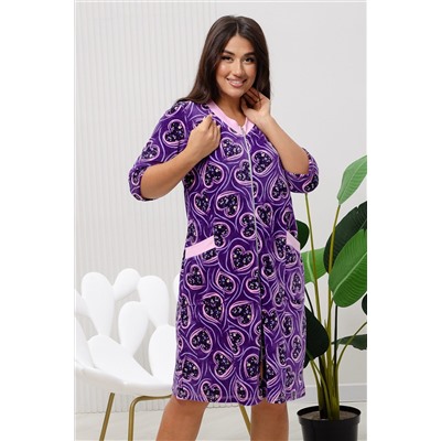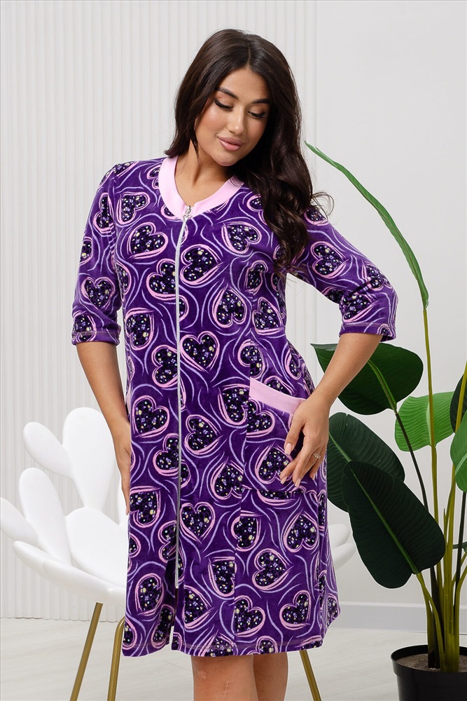Халат женский из набивного велюра на молнии. Воротник, рукава и карманы отделаны однотонным интерлоком, рукав 3/4, молния декоративная. Халат идеально подойдет для дома.