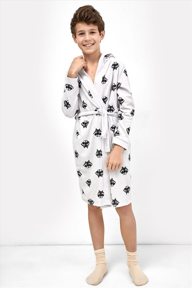 Махровый халат для мальчиков. Силуэт прямой, длина ниже коленей. Халат с запахом, со съемным поясом. Имеется уютный капюшон и вместительные боковые карманы. Комфортный халат!