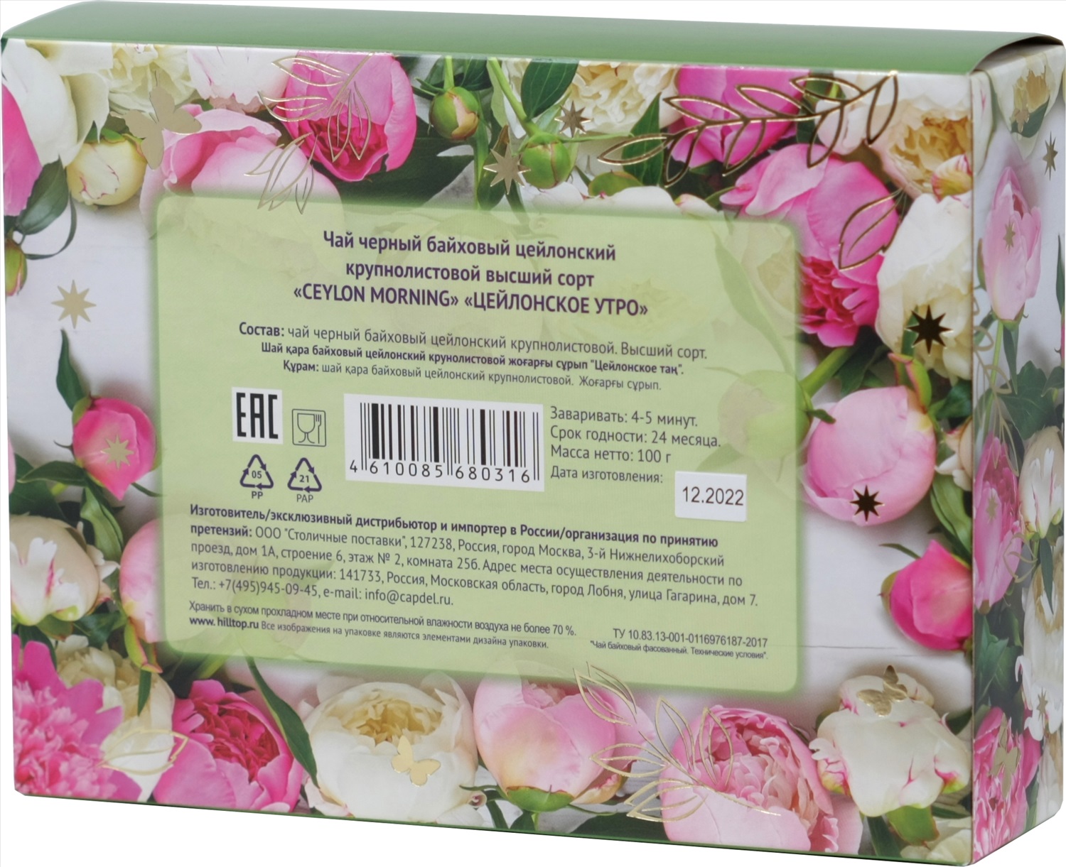 Черный байховый цейлонский чай «Цейлонское утро», высший сорт. Крупнолистовой.Цейлонское утро — классический цейлонский черный чай с терпким вкусом, мягким ароматом и тонизирующими свойствами. Идеальный вариант для утреннего чаепития.Яркая дизайнерская упаковка и высококачественный вкусный чай образуют отличный вариант подарка коллегам, подругам или близким на 8 марта.