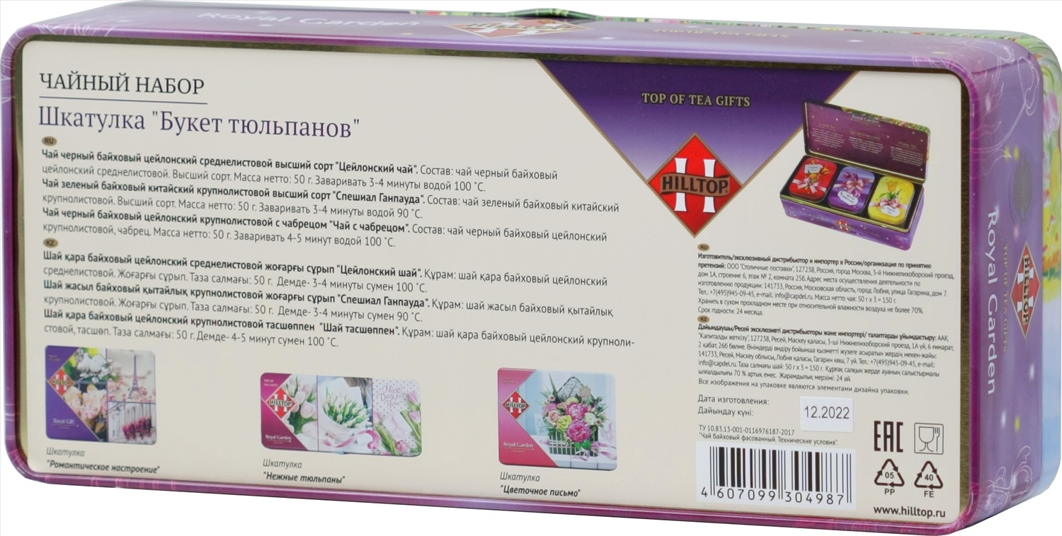 Подарочная шкатулка в авторском весеннем дизайне, внутри которой 3 жестяных баночки с отборными, высшими сортами чая:1. Черный среднелистовой цейлонский чай «Цейлонский чай» — 50 грамм. Регулярное употребление напитка замедляет старение клеток и укрепляет иммунитет.2. Зеленый крупнолистовой китайский чай «Special Gun Powder» — 50 грамм. Листочки этого чая имет шарообразное скручивание, при заваривании они раскрываются, превращая чаепитие в интересный процесс.3. Черный крупнолистововй цейлонский чай с натуральными растительными добавками «Чай с чабрецом» — 50 грамм. Благодаря эфирным маслам, которые содержит чабрец, такой чай станет лучшим лекарством при лечении простудных заболеваний.Будьте уверены, такая чайная шкатулка станет лучшим подарком на любой праздник!