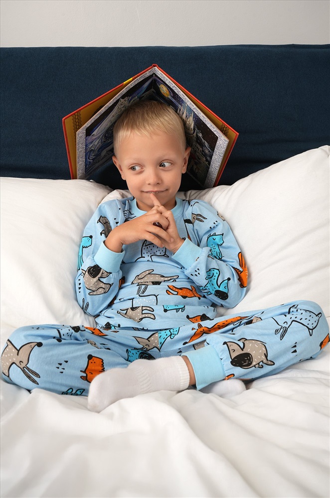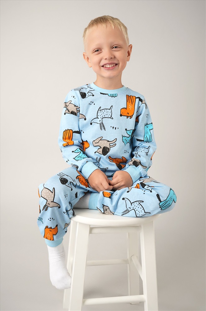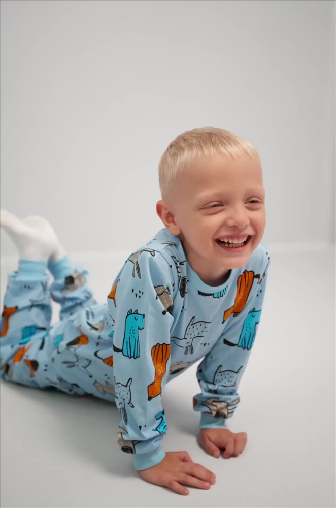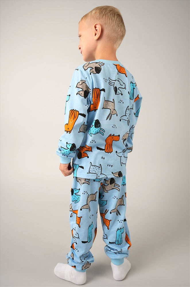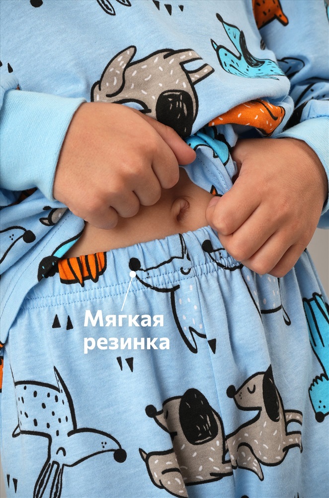 Очаровательная пижама для мальчика в нежном голубом цвете с ярким принтом Собачки сделает домашние вечера ещё уютнее. Хлопковая трикотажная ткань мягкая и приятная, а забавный рисунок добавляет настроения на каждый день.