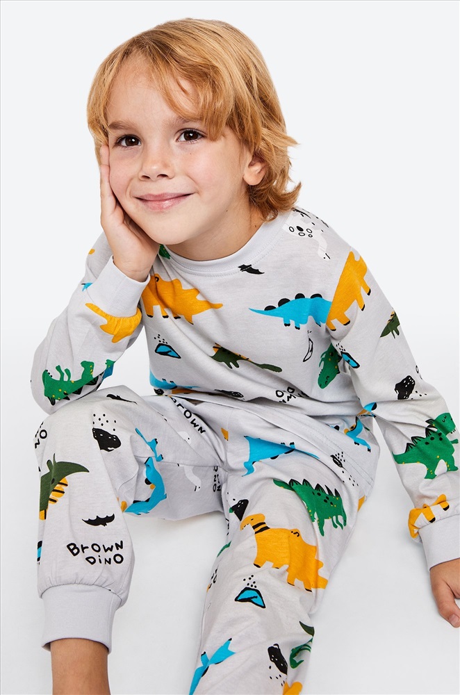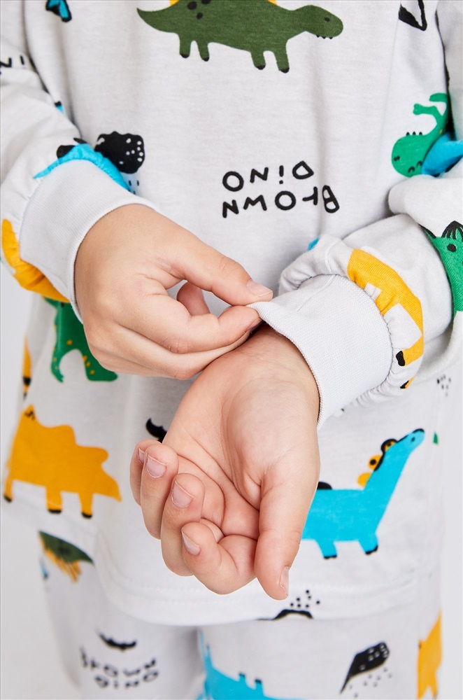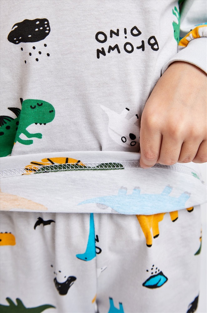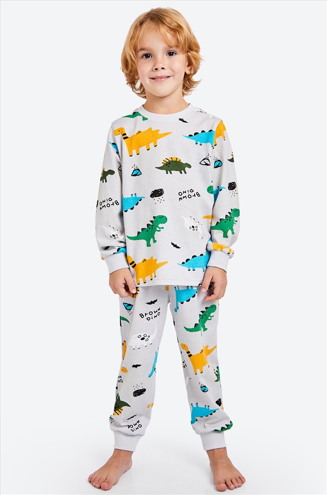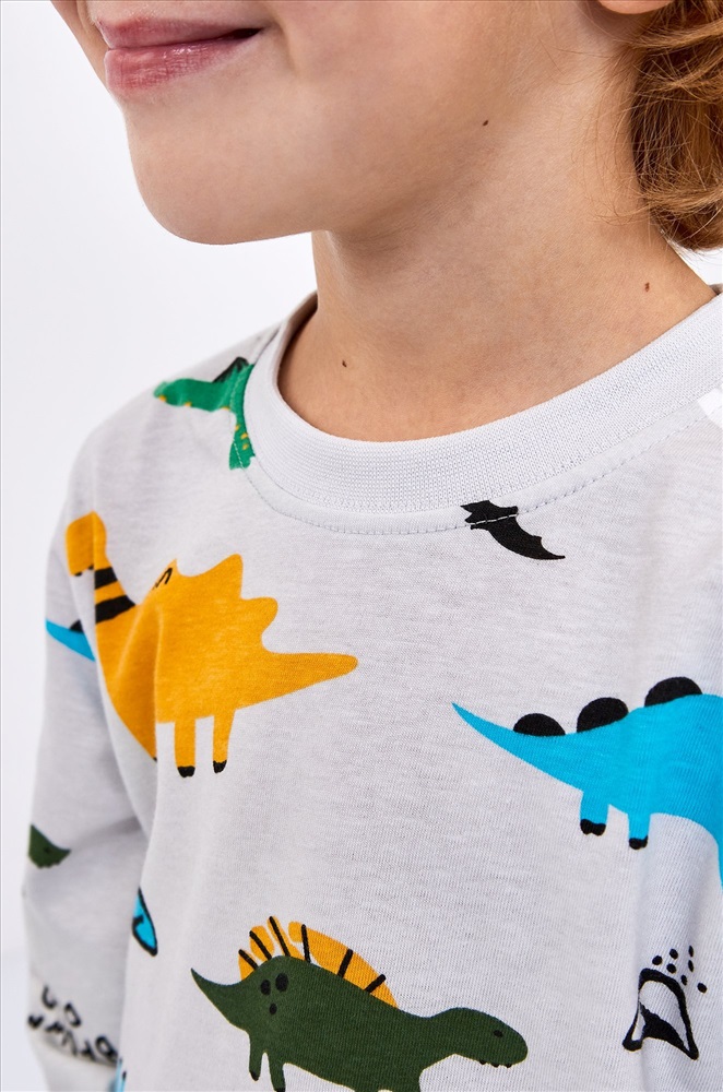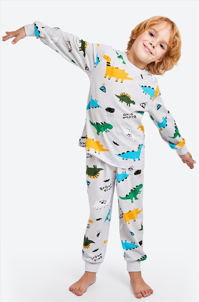Очаровательная пижама для мальчика в светло-сером цвете с ярким принтом Динозавры сделает домашние вечера ещё уютнее. Хлопковая трикотажная ткань мягкая и приятная, а забавный рисунок добавляет настроения на каждый день.