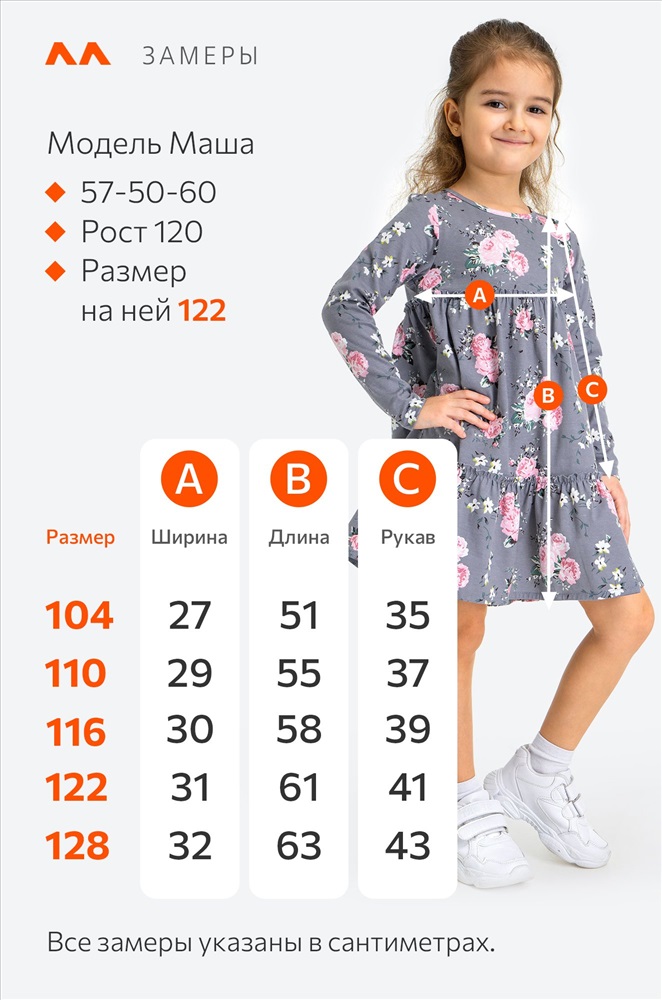 Модель Маша, рост 120 см, параметры 57-50-60 см. На ней платье из трикотажа размера 120.