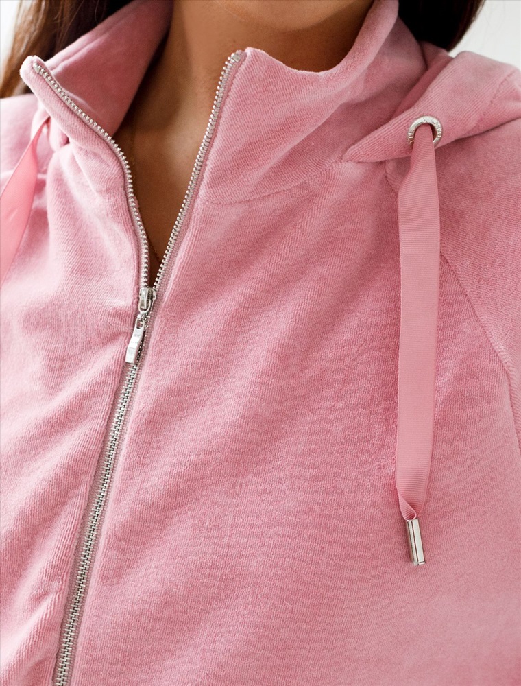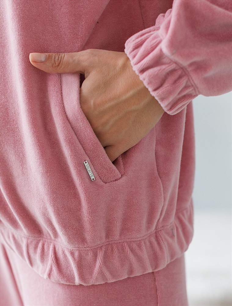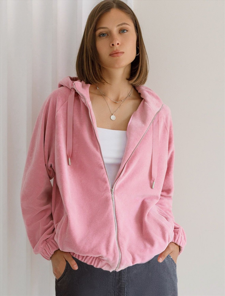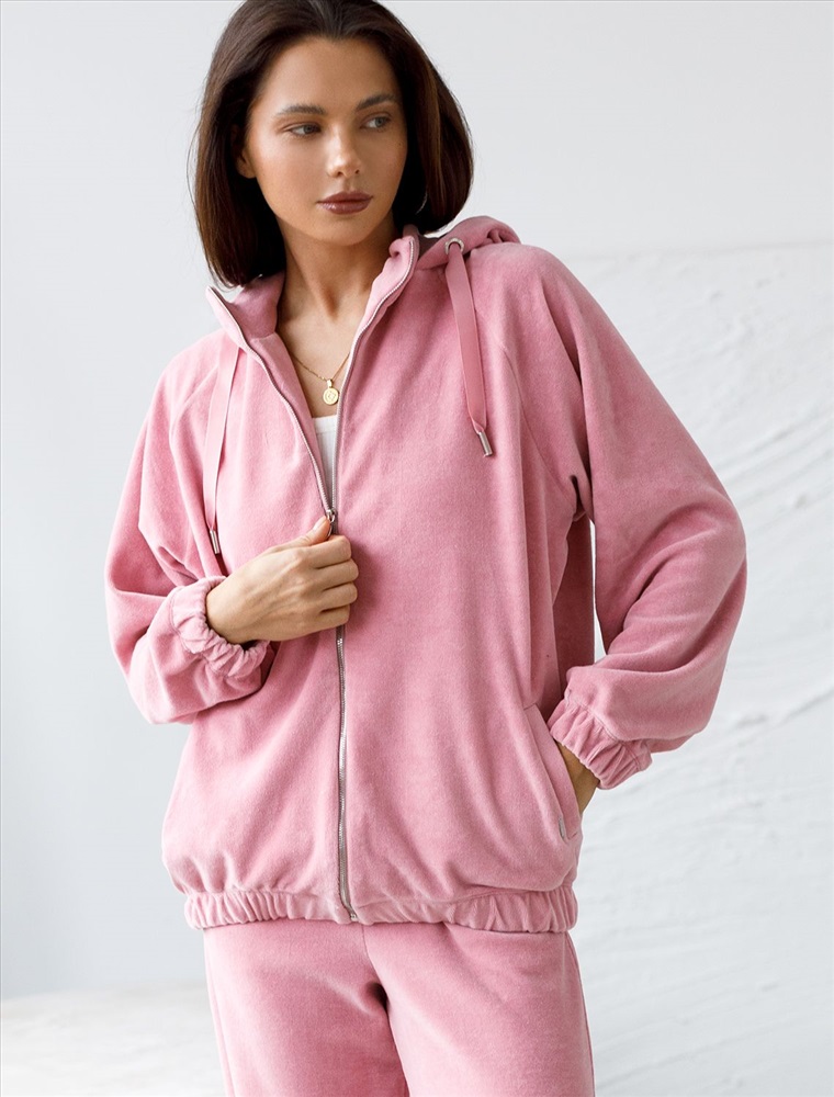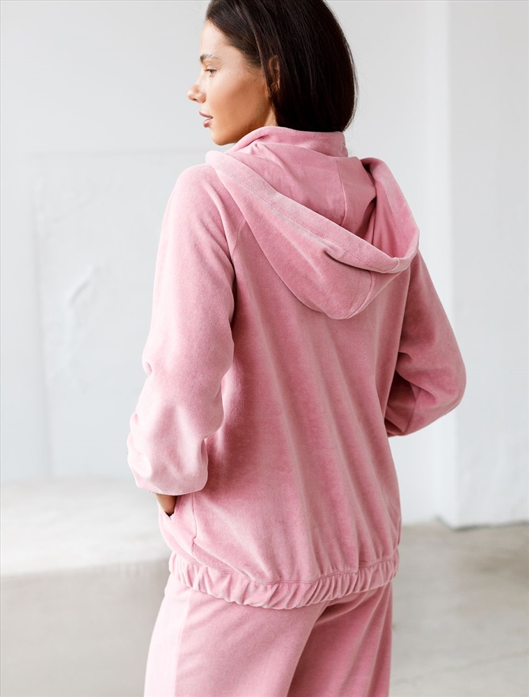 Плотность: 240 Г/м2 Параметры модели на первом фото: Рост 170, бюст 83, талия 64, бедра 88 Худи на двухсторонней молнии выполнено из бархатистого велюра. Модель дополнена резинкой по низу и боковыми карманами. Легкий и мягкий материал с матовой фактурой придает изделию нежность и комфорт. Хорошо держит тепло и форму – идеальное решение для домашнего отдыха. Сочетается в костюме с брюками D44.117 Комментарии к товару