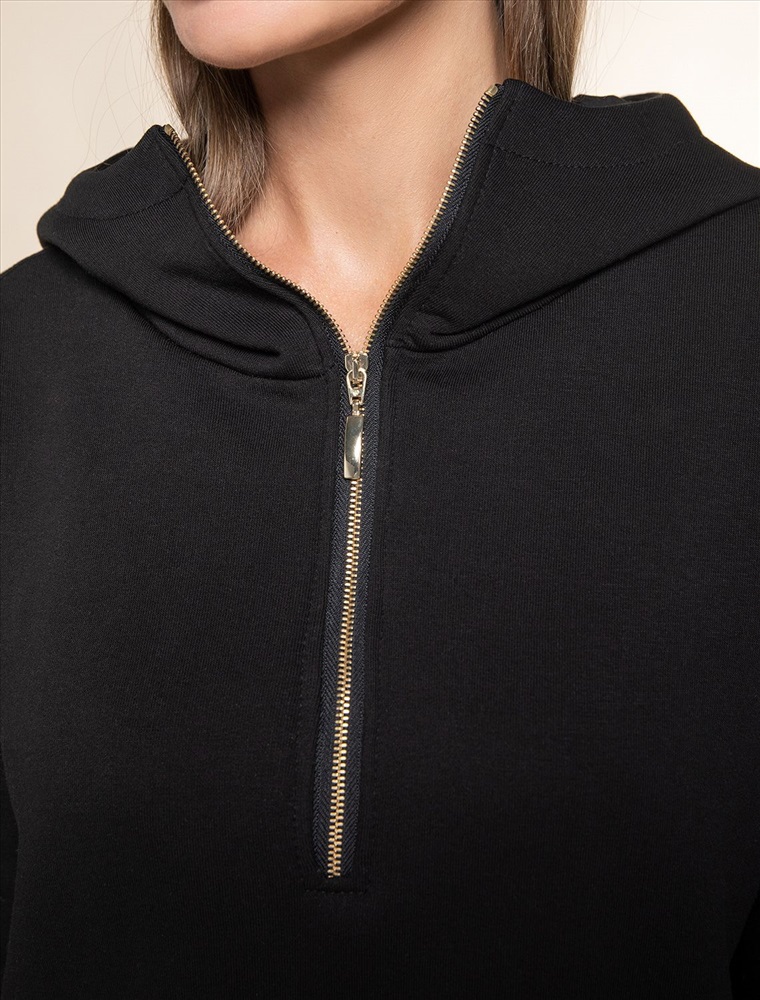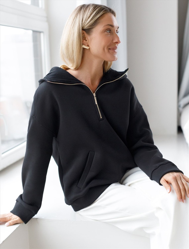 Худи с воротом на молнии выполнено из премиального футера трехнитки с теплым начесом. Модель дополнена боковыми карманами и золотистой фурнитурой, что поддерживает актуальный стиль спорт-шик. Свободный крой подходит для любой фигуры. Ранней осенью или поздней весной можно носить в качестве верхней одежды.