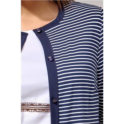 Костюм трикотажный, состоящий из джемпера, майки и брюк. Джемпер полуприлегающего силуэта. Рукава втачные, застежка на петли и пуговицы. Майка из натуральной ткани декорирована кружевом. Брюки классического кроя, зауженные к низу. В боковых швах карманы, в пояс вставлена резинка для лучшего прилегания.