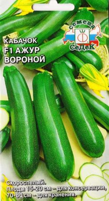 Скороспелый (47-50 дней) гибрид. Растение кустовое, мощное, лист среднерассеченный. Плоды темно-зеленые, цилиндрические, гладкие, слегка ребристые, выравненные, длиной в съемной спелости 15-20 см, при выращивании для зимнего хранения - до 70-80 см. Мякоть бело-кремовая, нежная, плотная. Вкусовые качества высокие. Ценность гибрида: высокая урожайность и товарность плодов, устойчивость к мучнистой росе и антракнозу. Рекомендуется для кулинарной переработки и консервирования.