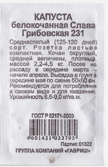 Среднеспелый (95-120 дней от всходов до технической спелости) сорт. Розетка компактная, полуприподнятая. Кочан округлый, средней величины, плотный, массой 2,2-4,5 кг. Внутренняя кочерыга средней длины. Наружная окраска зеленая, темно-зеленая, имеется средний восковой налет. Отличается дружностью созревания и высокой товарностью кочанов. Рекомендуется для употребления в свежем виде и для квашения. Урожайность 9 кг/м2. Выращивают рассадным способом.