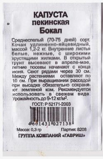 Среднеспелый (70 дней от полных всходов до технической спелости) сорт. Растение средней высоты, розетка полувертикальная. Кочан среднего размера, закрытый, плотный, окраска внешних листьев жёлто-зелёная, внутренняя - светло-жёлтая, пузырчатость внешних и внутренних листьев средняя. Внутренняя кочерыга не большая. Масса 1,5-2,0 кг. За вегетационный период получают два урожая. Первый посев на рассаду производят с 1 по 10 апреля. Пикировка в фазе семядолей. Высадка в грунт в начале мая. Второй посев на рассаду производят 20 июня. Высадка в грунт 5 июля. Схема посадки 40х40 см. ВНИМАНИЕ! Время высадки рассады нельзя задерживать, так как увеличивается склонность растений к цветушности. Вкусовые качества хорошие. Устойчив к стеблеванию. Рекомендуется для использования в свежем виде. Урожайность 9-12 кг/м2. Фасовка 0,3г Комментарии к товару
