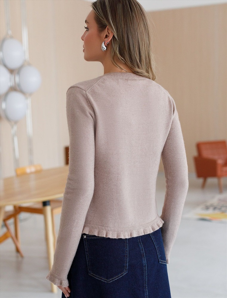 Размер товара на первом фото: 42 Кардиган выполнен из мягкой меланжевой пряжи с Романтичности прямому силуэту добавляют мягкие воланы по линии пуговиц, на манжетах и краю изделия. Застежка на пуговицы из натурального перламутра. Изделие очень приятное к телу, совершенно не колется и отлично сохраняет тепло. Сочетается в костюме с брюками D38.013, D38.012 и юбкой D36.016