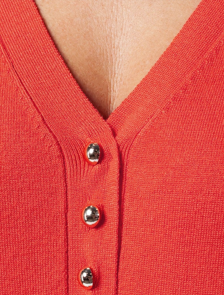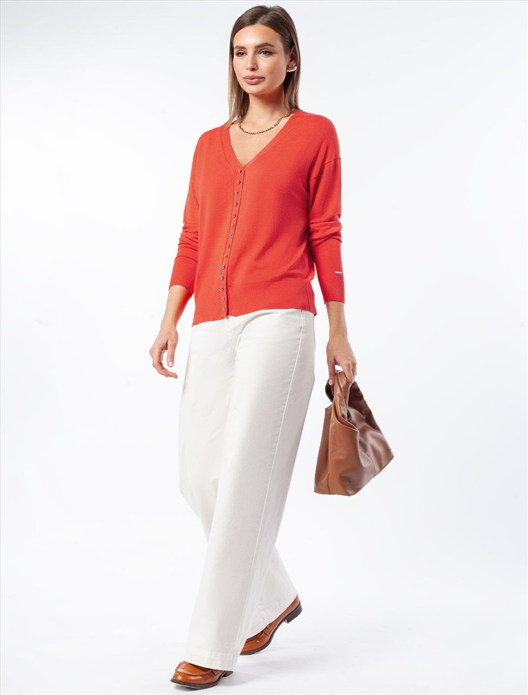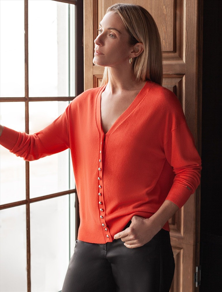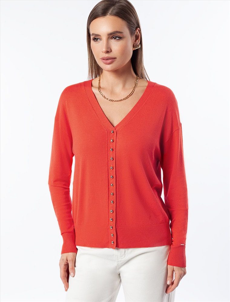 Кардиган тонкой вязки выполнен из нежной пряжи вискозы с нейлоном. Лаконичный силуэт дополнен яркой фишкой изделия - ряд золотистых пуговиц, визуально вытягивающий силуэт. Очень приятное к телу изделие, в котором будет не жарко даже в самые теплые дни. Изделие дополнено логотипом бренда.