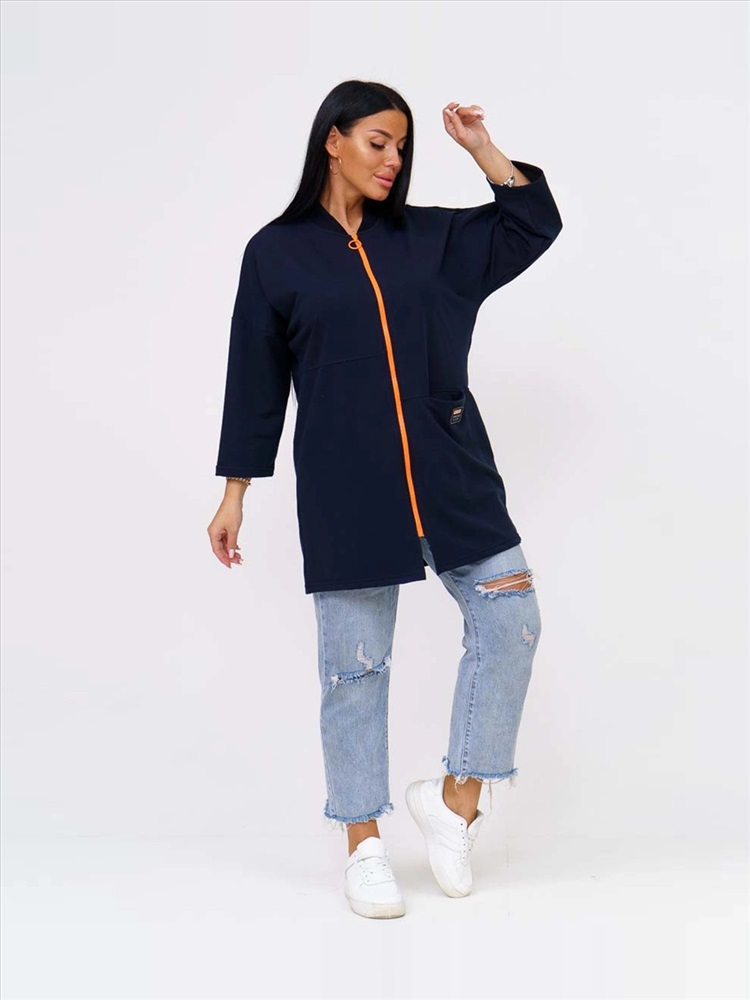 Состав: хлопок 75% / полиэстер 20% / лайкра 5% Цвет: синий Декоративные элементы: молния Кардиган женский на молнии,свободного силуэта длиной чуть ниже уровня бёдер. Полочка с ассиметричными швами, спереди в шве карман. Линия плеча спущена. Рукав втачной три четверти.Воротник из кашкорсе в цвет основного материала. Комментарии к товару