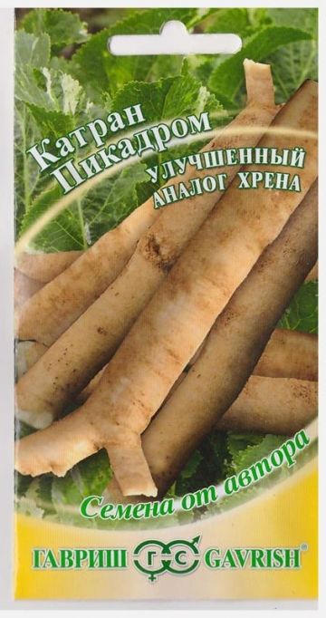Двух-трехлетняя культура, выращиваемая как улучшенный аналог хрена. Корни катрана богаче по химическому составу и вкусовым качествам, а также более технологичны при переработке (корешок не ветвится). Сорт рекомендован для использования в свежем и переработанном виде, как корней так и листьев. Розетка листьев полуприподнятая, хорошо облиственная. Листовая пластинка сизо-зеленая обратно-яйцевидной формы перисторассеченная с гладкой поверхностью. Корнеплод конический длиной 40см, диаметром 4 см. Масса корнеплода до 900гр! Окраска коры корнеплода серо-коричневая. Мякоть белая, ароматная, со вкусом и ароматом как у хрена. Посев семян в открытый грунт под зиму или весной после 3-х месячной стратификации. Рекомендуемая схема посадки – 70х40см. Средняя урожайность – 3,90 кг/м2.