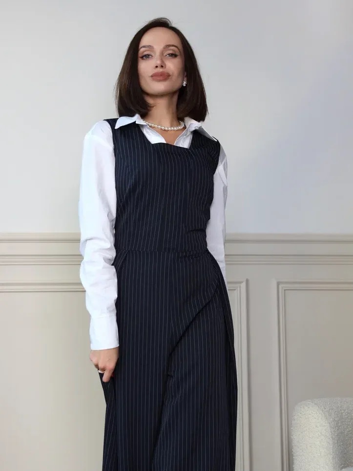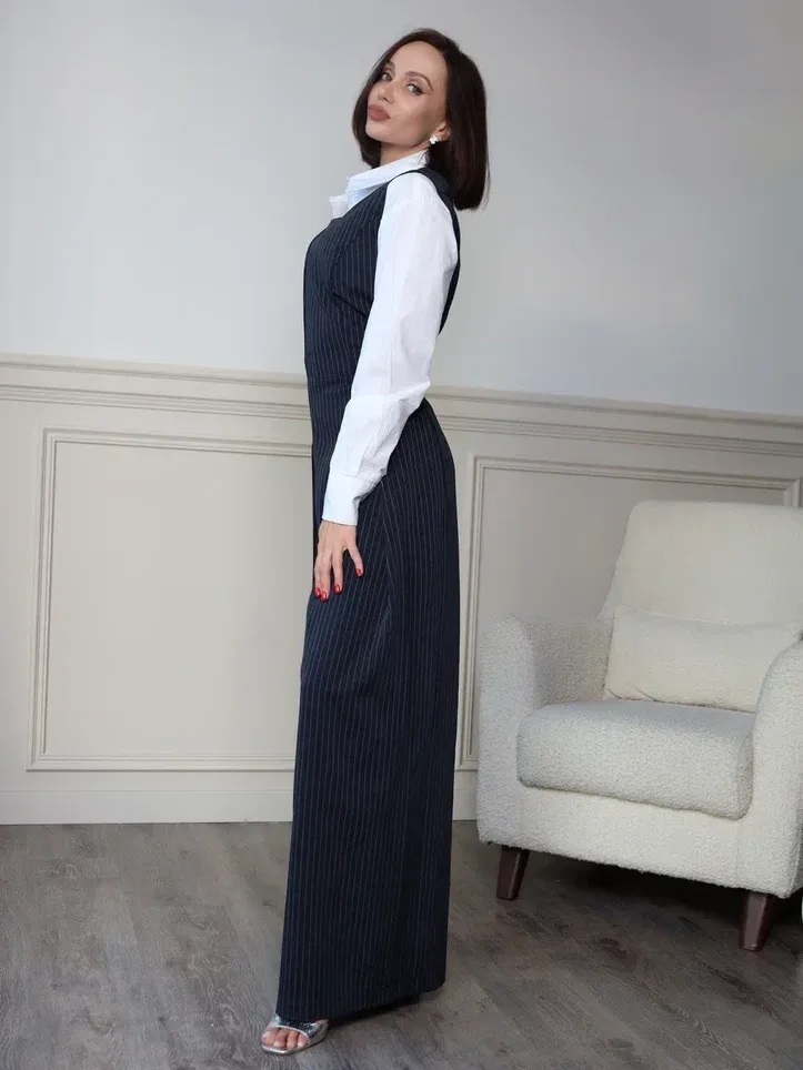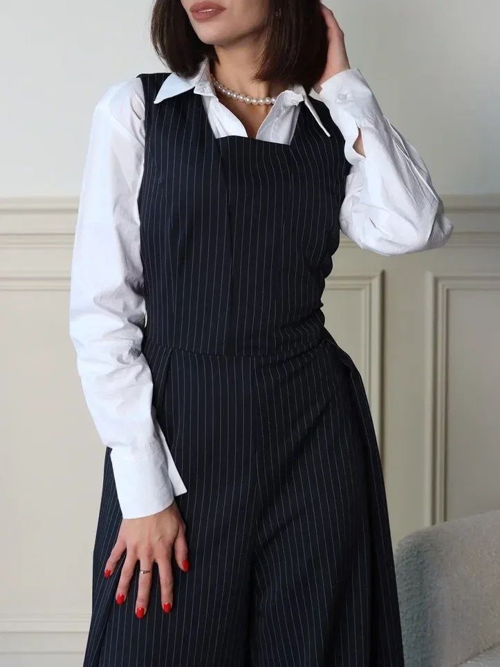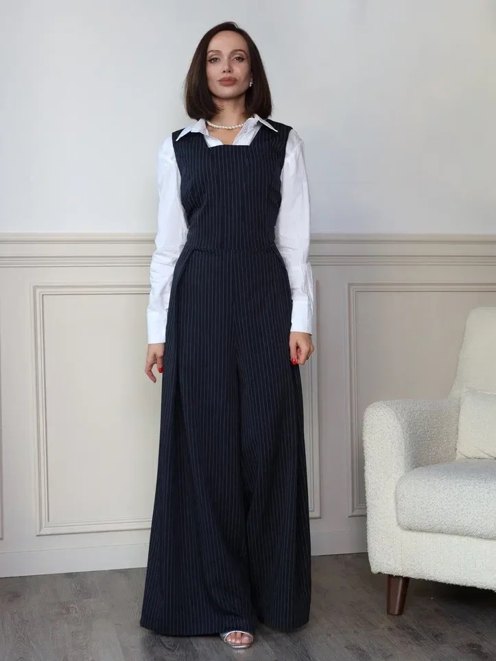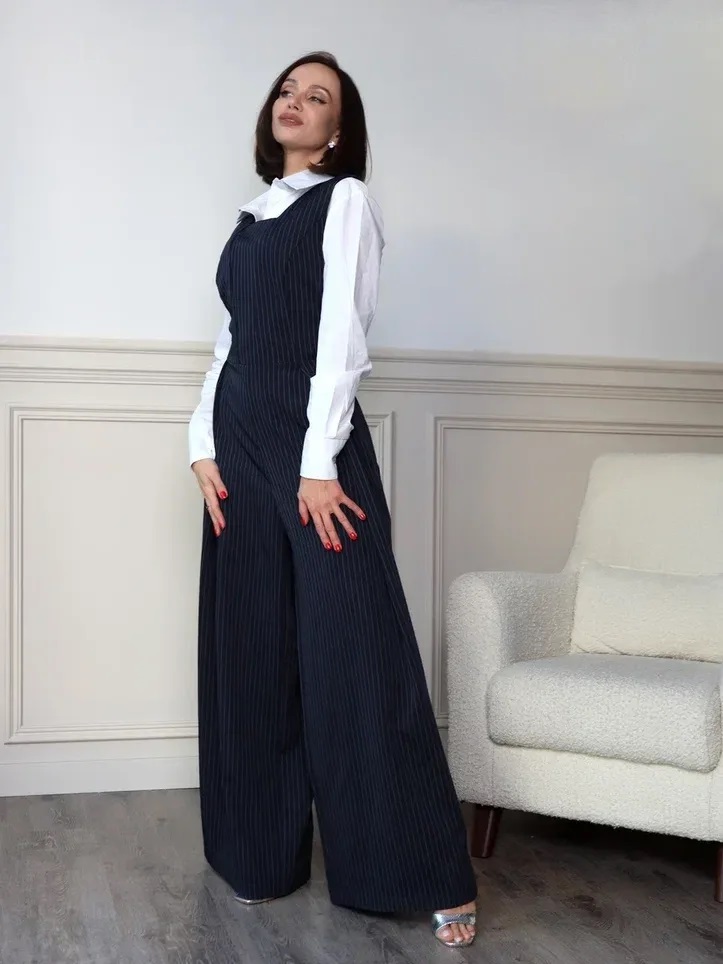 Комбинезон темно-синего цвета в полоску с широкими брюками-палаццо и глубоким вырезом-каре – это стильный и удобный выбор. Молния сзади облегчает надевание, а встроенные карманы добавляют практичности. Такой комбинезон станет отличным вариантом как для повседневных образов, так и для более торжественных случаев.