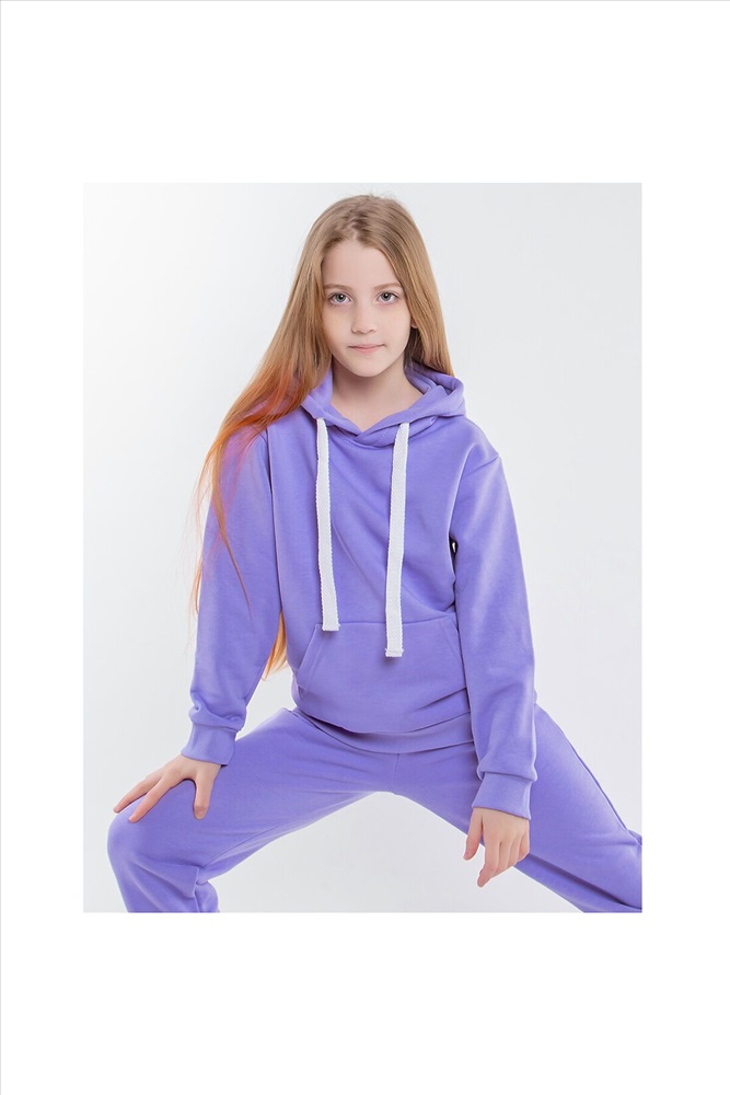 Спортивный костюм для девочки состоит из брюк и худи с капюшоном и карманом "кенгуру".