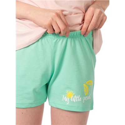 Верх- футболка со спущенным рукавом, вырез горловины округлый, неглубокий. Декоррирована принтом. Низ-шорты прямого кроя, пояс на резинке, деккорированы рисунком ( набивное полотно). Тип ткани: Кулирная гладь (супрем).