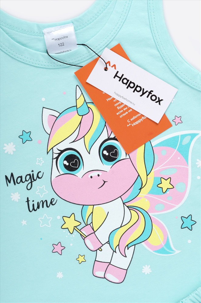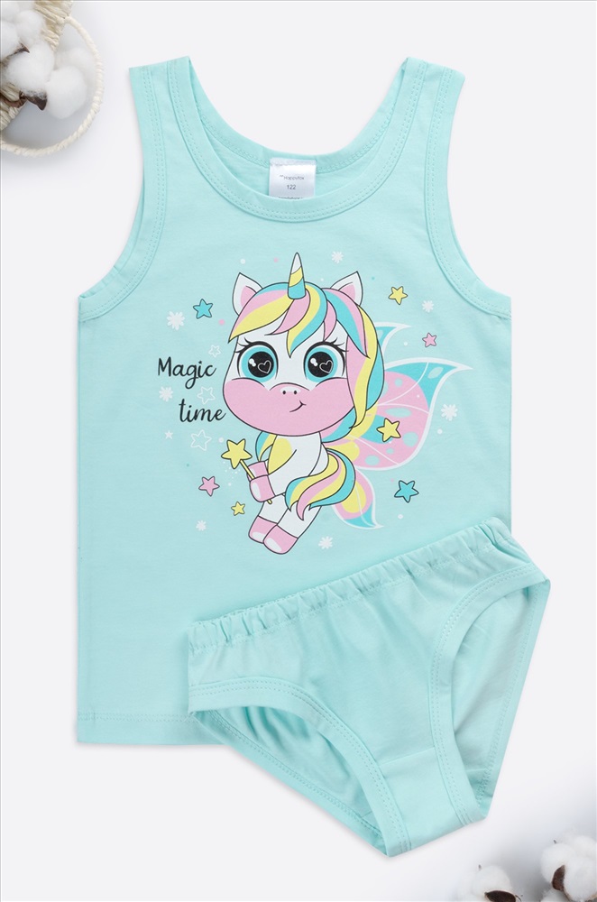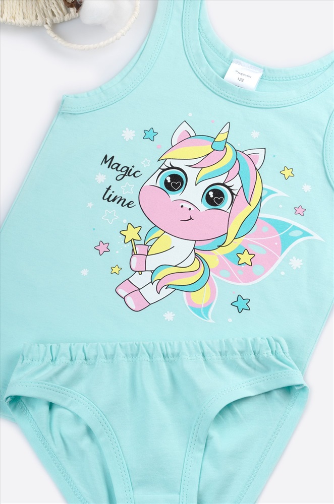 Детский набор из майки и трусов-слипов для девочек выполнен из натурального 100% хлопка. Голубой комплект станет любимым благодаря комфортной посадке и забавному принту Единорожка.