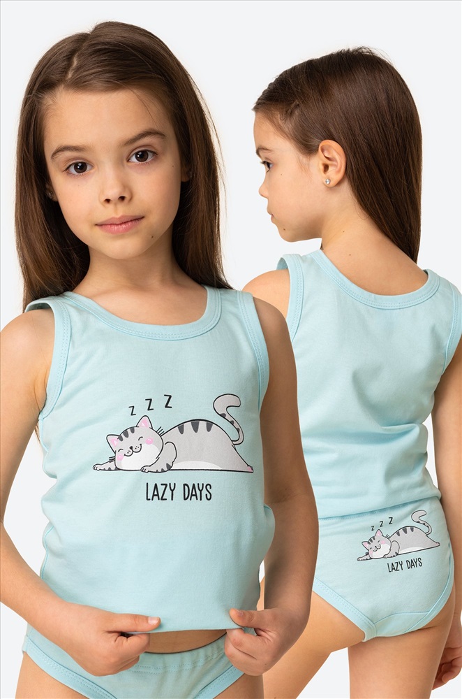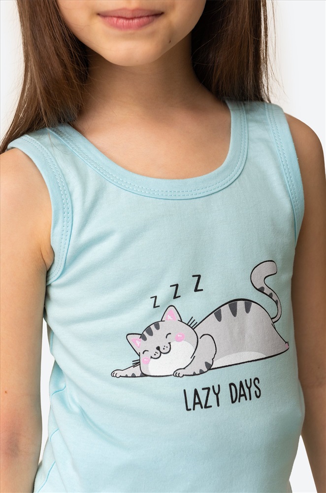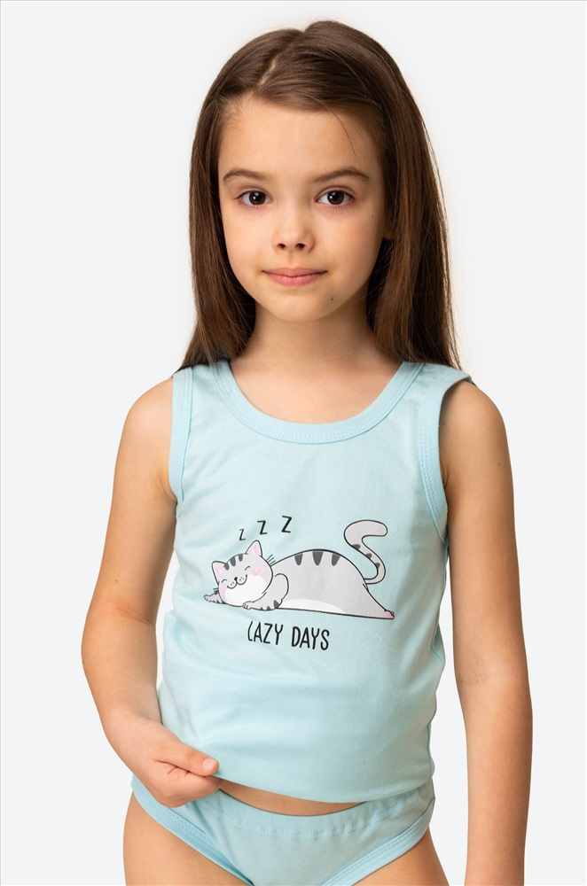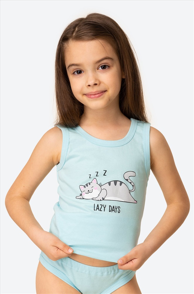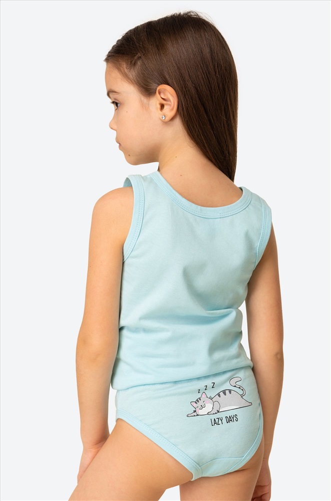 Мягкость, легкость и комфорт! Детский набор из майки и трусов слипов для девочки выполнен из натурального 100% хлопка. Мятный комплект для детей станет любимым в гардеробе благодаря милому принту Котик.