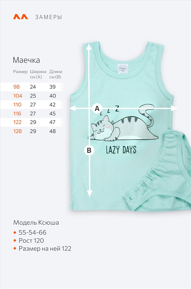 В наборе базовая маечка и трусики из трикотажа. Эластичная резинка слипов нежно прилегает к телу. Широкие бретели майки не спадают во время активных движений.