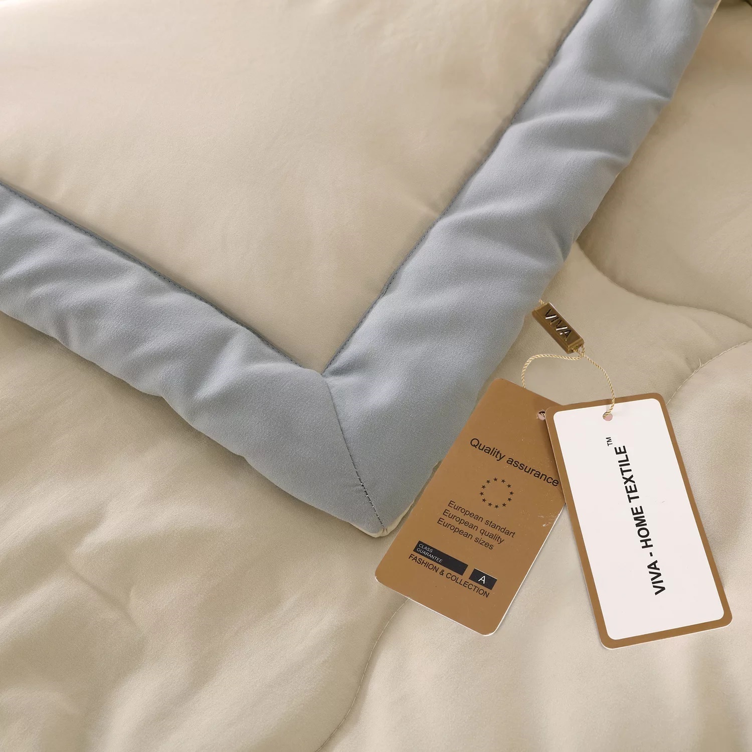 Габариты: 50 x 40 x 15 см Упаковка: ПВХ упаковка Цвет: Серый, Кремовый Ссылка на видео: https-//www.youtube.com/embed/LymqkPl18uU Тип простыни: Обычная Состав: 70% хлопок 30% пэ | одеяло из бамбукового волокна Наволочки с запахом и с кантом по периметру. Одеяло-покрывало с кантом по периметру. Одеяло в комплекте цельное, нераздельное: пододеяльник не является съёмным Плотность: 125 гр/м2 Одеяло-покрывало (стеганое): бамбуковое волокно Простыня: 230*250 см 1 шт Наволочки: 50*70 2 шт. (с запахом) Комплекты из данной коллекции одновременно сочетают в себе утончённый стиль и особенную практичность. Вам больше не придётся уделять много времени на то, чтобы заправить постель. На смену классическому пододеяльнику пришло комфортное одеяло, также выполняющее функцию покрывала и соответствующее дизайну комплекта. Стеганое одеяло-покрывало из бамбукового волокна прекрасно подходит для людей с чувствительной кожей. Антибактериальные свойства бамбукового волокна не снижаются даже после нескольких десятков стирок. Зимой под таким одеялом тепло и уютно, а летом, благодаря отличной воздухопроницаемости, совсем не жарко. Бамбуковые волокна прекрасно впитывают влагу и быстро сохнут благодаря пористой структуре. Это постельное бельё выдерживает большое количество стирок и отлично сохраняет свой цвет. Наволочки с запахом и с кантом по периметру. Одеяло-покрывало с кантом по периметру. Одеяло в комплекте цельное, нераздельное: пододеяльник не является съёмным. Изображения, элементы, расположение рисунка и цвет представленного на упаковке товара могут незначительно отличаться от оригинала. Состав: 70% хлопок, 30% пэ. Размеры комплектов постельного белья: Евро Одеяло-покрывало (стеганое): 200*220 см 1 шт. Простыня: 230*250 см 1 шт. Наволочки: 50*70 2 шт. (с запахом) Комментарии к товару