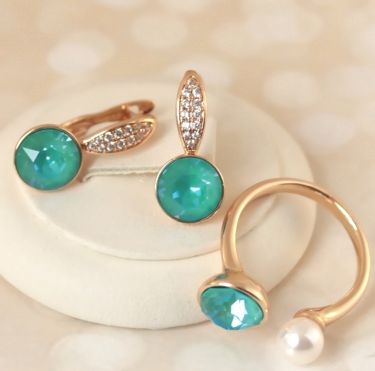 Материал: бижутерный сплав. Покрытие: золото 18К. Вставка: австрийские кристаллы Размер серьги: 1,9 см Размер камня: серьги-0,9 см. кольцо-0,9 см Цвет камня: бирюзовый. Комментарии к товару
