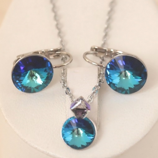 Материал: бижутерный сплав. Покрытие: родий. Вставка: австрийские кристаллы. Размер серьги: 1,8 см. Длина цепочки: 40-45 см. Размер камня: серьги - 1 см. кулон - 0,8 см. Цвет камня: морская волна. Комментарии к товару