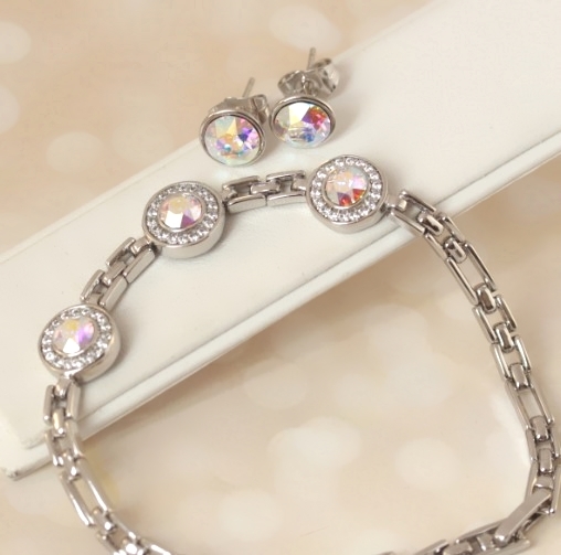 Материал: бижутерный сплав. Покрытие: родий. Вставка: австрийские кристаллы. Длина браслета: 17-19 см. ( с увеличителем) Размер камня: серьги -гвоздики -0,8 см (с ободком) Цвет камня: хамелеон. Комментарии к товару