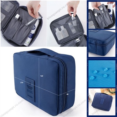 Косметичка-кейс-органайзер, Travel ,цвет Темно-синий,1 шт. Размер 22*18*8 см. Сочетает в себе вместительность, стильный дизайн и многофункциональность. Такую штучку оценит каждый, кто любит путешествовать или часто ездит в командировки. В основное отделение легко помещается несколько стандартных емкостей с гелем для душа, шампунем, кондиционером, антиперспирантом и пр. Кроме основного отделения предусмотрены два сеточных кармана для кремов, салфеток, ежедневок и любых других мелочей. Дополнительное преимущество такой модели органайзера для путешествий ― отстегивающийся кармашек, в который можно сложить декоративную косметику, кисти для макияжа и пр, и использовать как органайзер для хранения косметики в поездке вне душевой комнаты. Органайзер имеет удобную ручку для транспортировки и застегивается на молнию. Такой органайзер пригодится и в повседневной жизни потому, что его можно брать с собой на пляж для солнцезащитной косметики и использовать как сумку для мокрого купальника, использовать как косметичку для визажистов, актеров театра и кино, танцовщиц и др., брать с собой в зал и бассейн. Такая стильная вещь будет эффектно смотреться в любых обстоятельствах, а так же может стать отличным вариантом подарка. Материал Нейлон, сетка. Способ примененияСоберите необходимые для ежедневного ухода косметические принадлежности и аккуратно положите их в сумочку. Когда косметичка будет полностью наполнена, закройте её на молнию. Не накладывайте очень много продуктов — боковые части изделия не должны сильно выпирать. вес 100 гр.