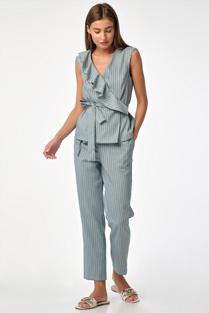 Цвет: полоска на серо-зеленом • Тип горловины: V-образный • Линия плеча: на естественном месте • Длина изделия: блуза 56см, брюки 94см • Силуэт: прилегающий • Карманы: в боковых швах • Пояс: в комплекте • Посадка: средняя • Застежка: молния • Особенности: Летний хлопковый костюм состоит из блузы прямого силуэта и укороченных брюк прилегающего силуэта. Детали блузы: на правой полочке волан, застежка на потайную кнопку, длинный пояс. Детали брюк: брючные карманы, притачной пояс с застежкой на две пуговицы. • Параметры модели: 83-61-89 • Рост модели на фото: 171 см • Размер модели на фото: 40 р-р Комментарии к товару