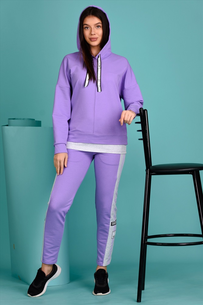 Для: Женщин Бренд: Натали Вид изделия: Комплекты женские Состав материала: хлопок 72%, ПЭ 20%, эластан 8% Цвет: Фиолетовый Код товара: НФ-00062227 Костюм состоит из толстовки и брюк. Толстовка прямая, свободная, с капюшоном, с длинным рукавом на манжете. Низ полочки и спинки завершен поясом. Брюки с карманами, на поясе. Вдоль боковых швов расположены лампасы из отделочного полотна. Комментарии к товару