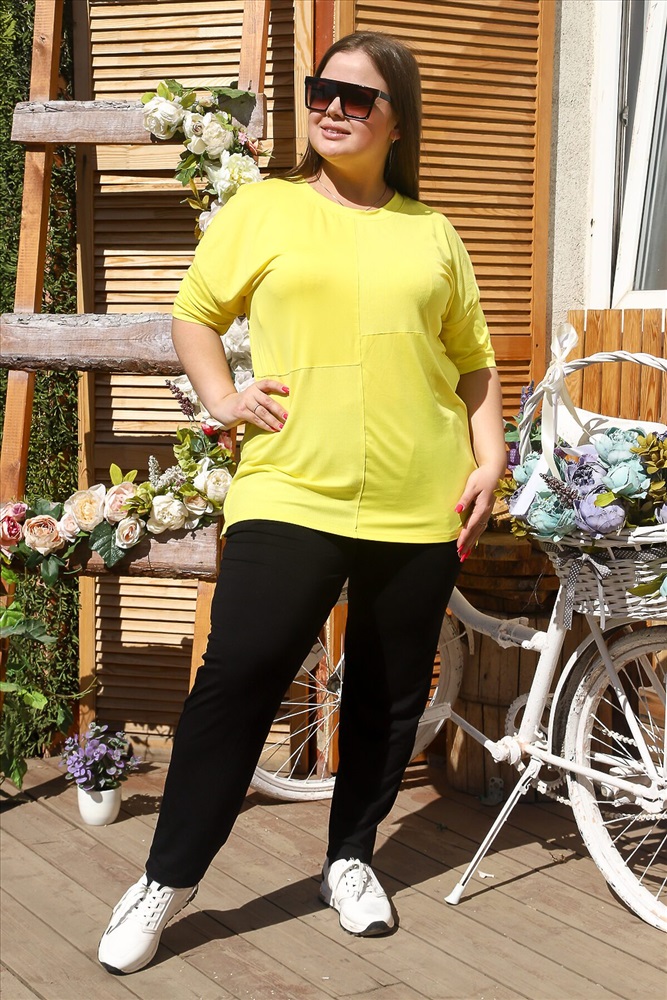 Костюм состоит из футболки и брюк. Футболка прямого силуэта, с округлой горловиной, с удлиненной спинкой, с разрезами в нижней части боковых швов. На полочке расположены вставки из отделочного полотна. Спинка с кокеткой. Рукав короткий, обработанный эластичным манжетом. Горловина обработана эластичной обтачкой. Брюки на поясе, с боковыми карманами. В верхней части передних половинок по шву притачивания пояса расположены складки. На моделях 48 и 52 размеры