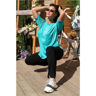 Костюм состоит из футболки и брюк. Футболка прямого силуэта, с округлой горловиной, с удлиненной спинкой, с разрезами в нижней части боковых швов. На полочке расположены вставки из отделочного полотна. Спинка с кокеткой. Рукав короткий, обработанный эластичным манжетом. Горловина обработана эластичной обтачкой. Брюки на поясе, с боковыми карманами. В верхней части передних половинок по шву притачивания пояса расположены складки. На моделях 48 и 52 размеры