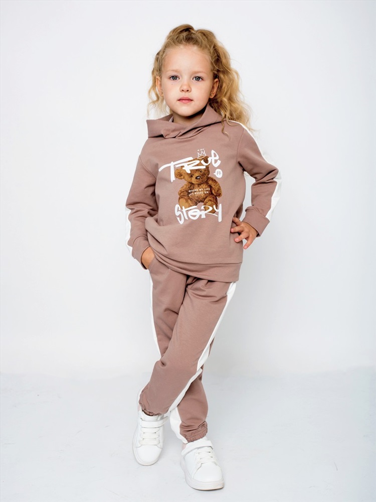 Рисунок: Мишка Симпатичный детский костюм, состоящий из кофты и брюк. Кофта имеет капюшон, на рукавах и по низу модели мягкие трикотажные манжеты. Брюки на удобной широкой резинке, по бокам - два внутренних кармана, по низу изделия имеются мягкие резинки. Костюм украшают классный принт на полочке и контрастные вставки на рукавах и по бокам штанов. Материал костюма - футер 2-нитка. Замеры модели: Размер 104: кофта - длина 43 см, ширина 36 см, рукав 32 см, штаны - длина по внешнему шву 59 см, длина по внутреннему шву 42,5 см; Размер 110: кофта - длина 44,5 см, ширина 37 см, рукав 36 см, штаны - длина 63,5/45,5 см; Размер 116: кофта - длина 47 см, ширина 38,5 см, рукав 39 см, штаны - длина 67,5/50 см; Размер 122: кофта - длина 48,5 см, ширина 39 см, рукав 40,5 см, штаны - длина 70,5/52 см; Размер 128: кофта - длина 50 см, ширина 39 см, рукав 43,5 см, штаны - длина 75/57 см.
