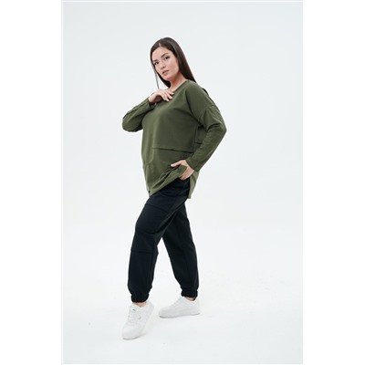 Костюм женский: туника и брюки. Туника прямого силуэта, горловина круглая, рукав длинный, цельнокроеный со швом., состоит из передней и задней частей. Полочка из четырех частей: на правой части внутренний горизонтальный карман в шве, на левой горизонтальный шов с открытыми срезами, аналогичный шов на спинке и на передней части брюк. В боковых швах разрезы. Брюки свободные по бедрам, зауженные к низу, на передней части брюк внутренние карманы. Пояс выполнен на многоигольной машине.