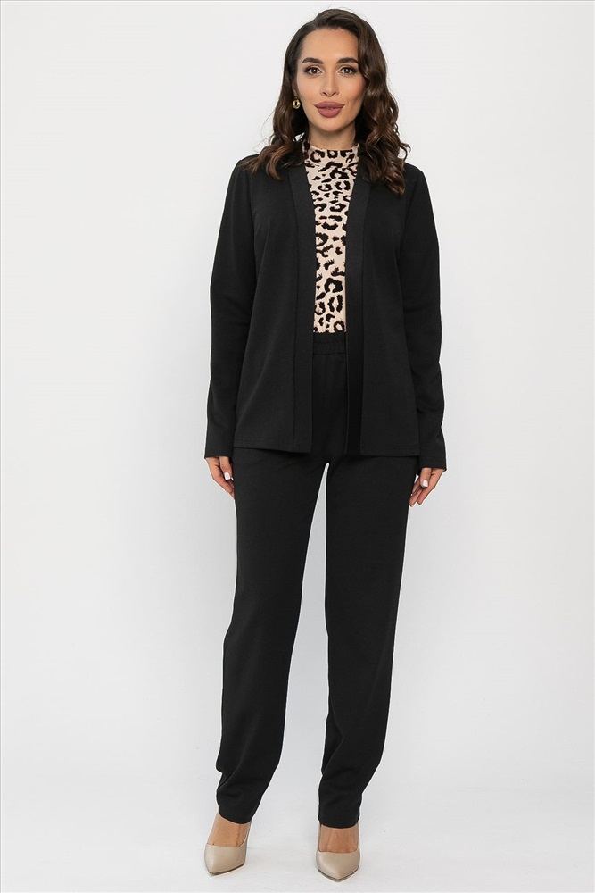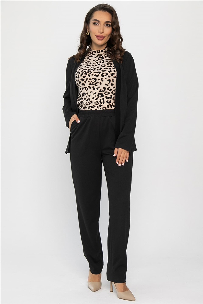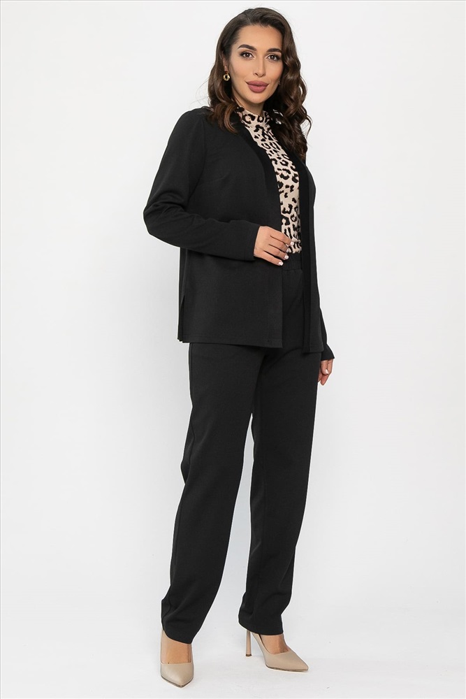 Женский брючный костюм в базовом черном цвете — это идеальное сочетание стиля и удобства. Он состоит из классических прямых брюк и элегантного жакета. Подходит как для офиса, так и для учебы. Это отличное решение для тех, кто стремится к практичности и стилю в одном!