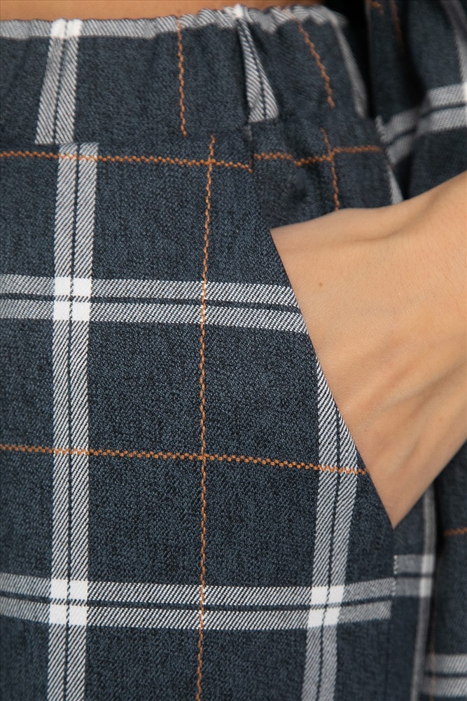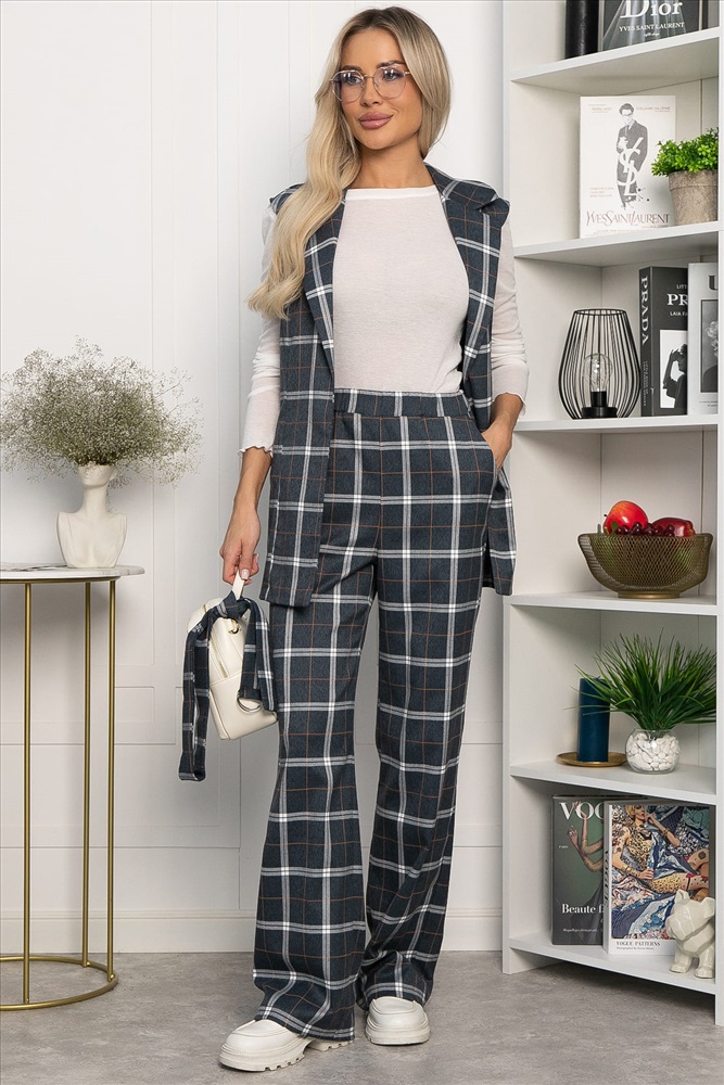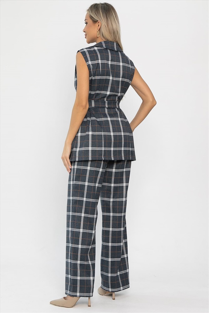 Стильный брючный костюм в клетку, состоящий из жилета и брюк, отлично подойдет как для повседневной носки, так и для деловых встреч. Жилет можно дополнить поясом из основной ткани, который идет в комплекте. С поясом образ получится более утонченный. Жилет без подкладки и без карманов. Оригинальный отложной воротник добавляет элегантности образу. Брюки классические по талии на резинке. В боковых швах расположены карманы.