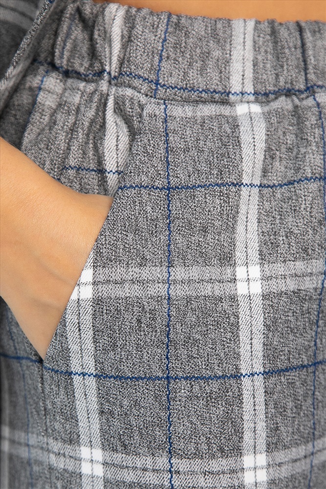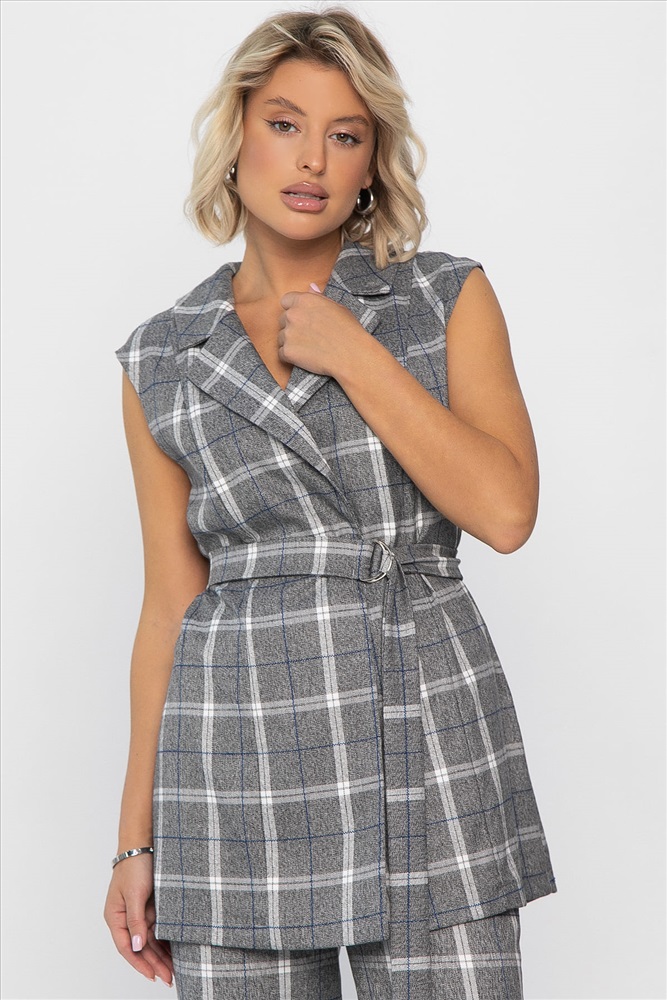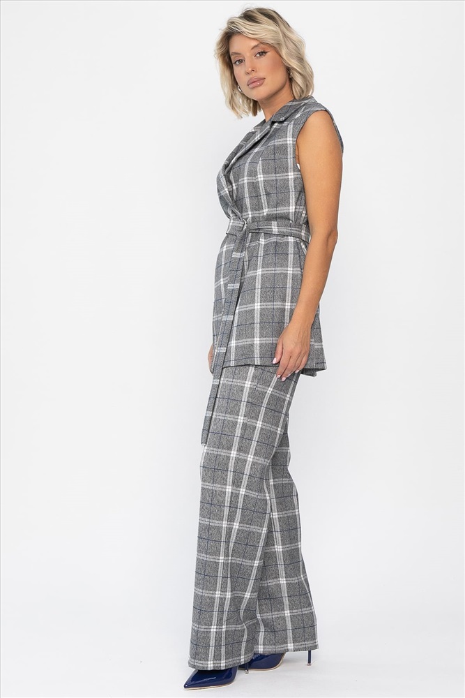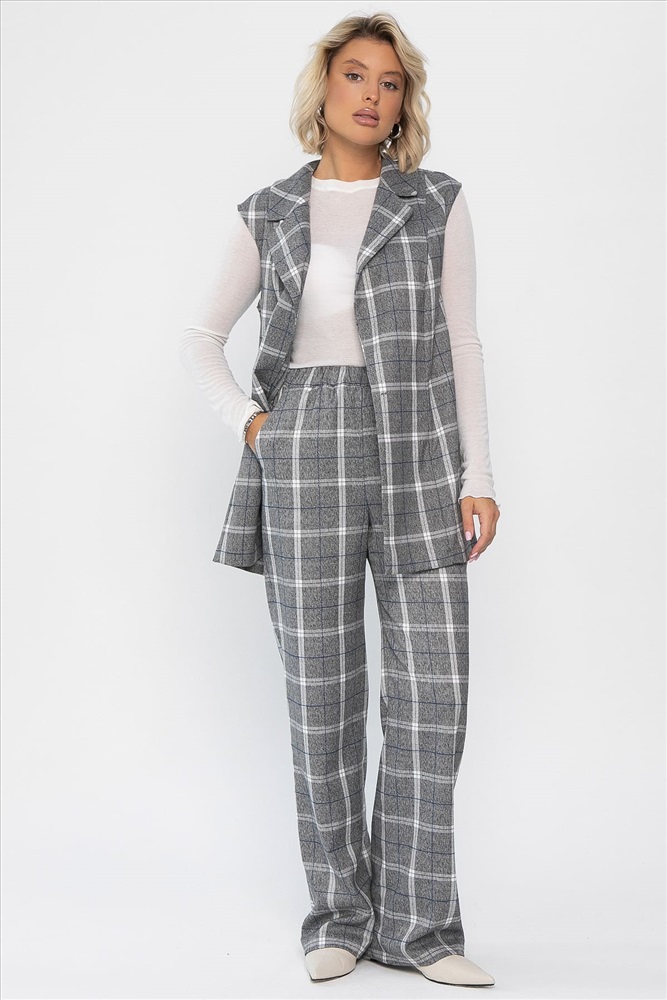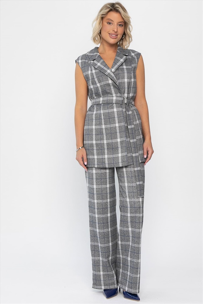 Стильный брючный костюм в клетку, состоящий из жилета и брюк, отлично подойдет как для повседневной носки, так и для деловых встреч. Жилет можно дополнить поясом из основной ткани, который идет в комплекте. С поясом образ получится более утонченный. Жилет без подкладки и без карманов. Оригинальный отложной воротник добавляет элегантности образу. Брюки классические по талии на резинке. В боковых швах расположены карманы.