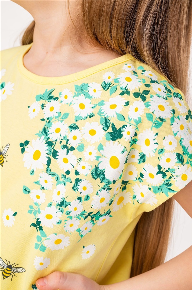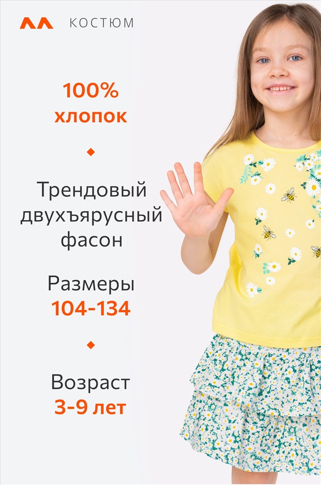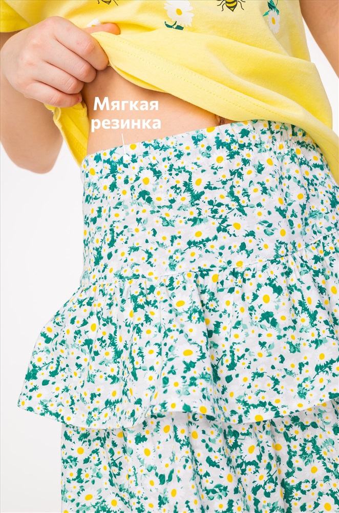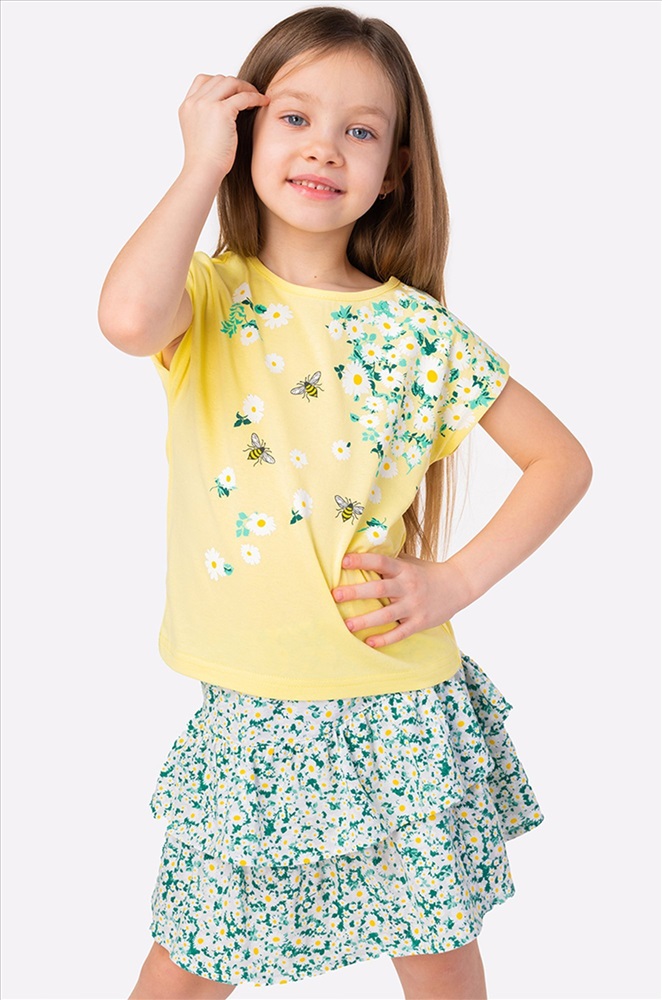 Лето – время для ярких эмоций и солнечного настроения! Детский костюм с юбкой для девочки создан для теплыx дней, веселых прогулок и беззаботных игр. Летний комплект выполнен в ярком желтом цвете и украшен цветочным принтом с очаровательными ромашками и забавными пчелками, создавая нежный и нарядный образ.
