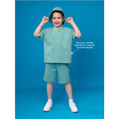 Костюм- двойка из футера малахитового цвета для мальчика. Состоит из футболки и шорт. Футболка свободного силуэта со спущенной линией плеча и короткими рукавами. Горловина округлая. Шорты удлиненные, с боковыми карманами. Задние половинки с кокетками и одним накладным карманом, пояс на эластичной резинке. Низ шорт с отворотами. Изделие выполнено из трикотажа премиального качества - ПЕНЬЕ, с содержанием хлопка более 92%