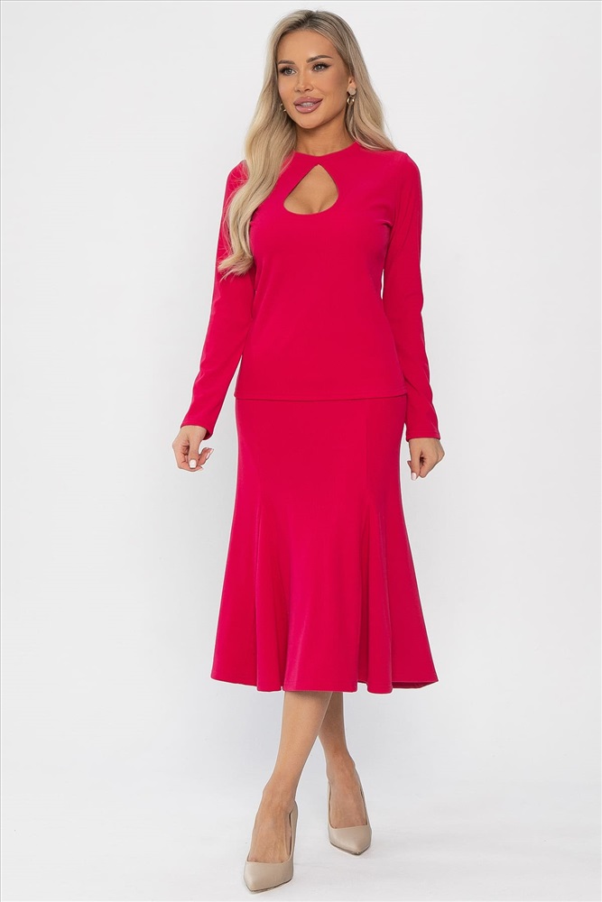 Женственный юбочный костюм в оттенке фуксии — идеальный выбор для создания нежного образа! Лонгслив приталенного кроя с втачным рукавом. Верхняя часть переда украшена кокетливым вырезом «капелька». Юбка-годе изящного силуэта дополнена резинкой на талии, что создает стройный и женственный силуэт. Костюм подойдет как для повседневной жизни, так и для романтичных встреч, и позволит вам чувствовать себя уверенно и стильно.