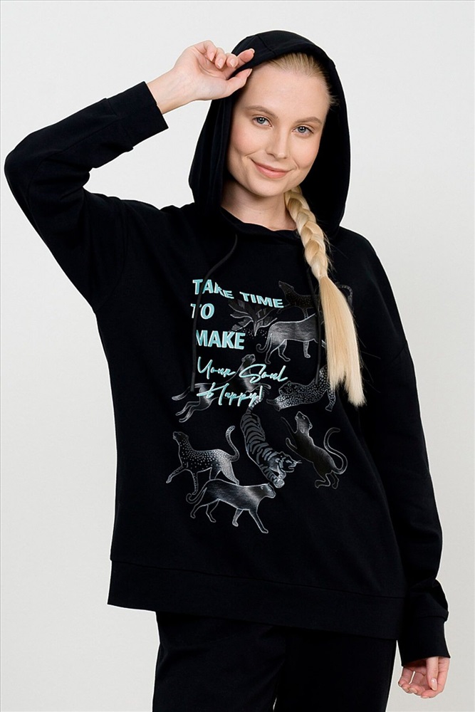 ID товара: 749377 Состав: верх- 96% Хлопок, 4% Эластан, низ- 96% Хлопок, 4% Эластан Сезон: Весна/Лето Длина: Средняя Фасон: Свободный крой Рукав: Длинные Вид застежки: Без застежки Крой брючин: Зауженный Вырез горловины: Капюшон Рисунок: Надпись Тип карманов: Прорезные Декоративные элементы: Печатный принт Основная ткань: Хлопок Стиль: Спортивный Страна бренда: Россия Страна производства: Китай Комплект женский толстовка, брюки. Толстовка с капюшоном среднего объема с крупным эластичным glossy принтом тон в тон. Перевод Найдите время, чтобы сделать свою душу счастливой. Брюки прямые с высокой посадкой без манжет, с карманами по бокам. Дополнительная регулировка объема декоративным шнуром по талии. Комментарии к товару