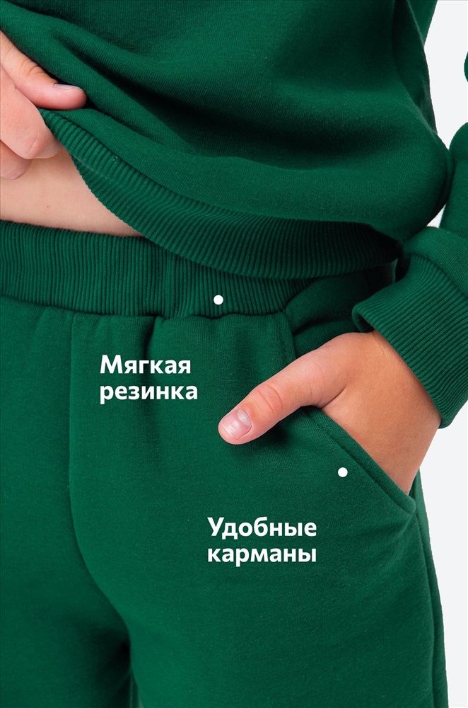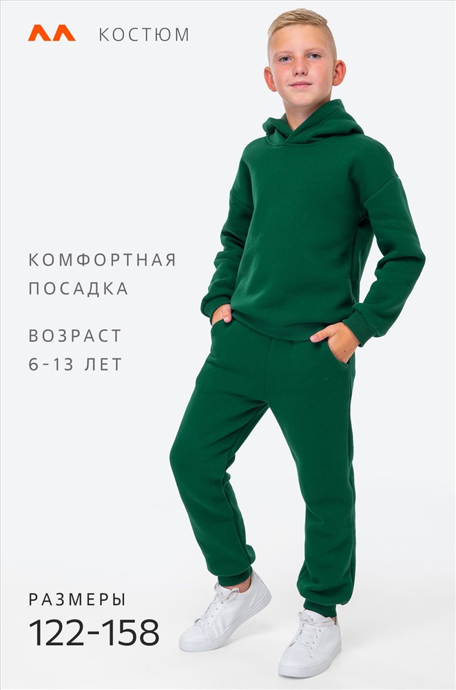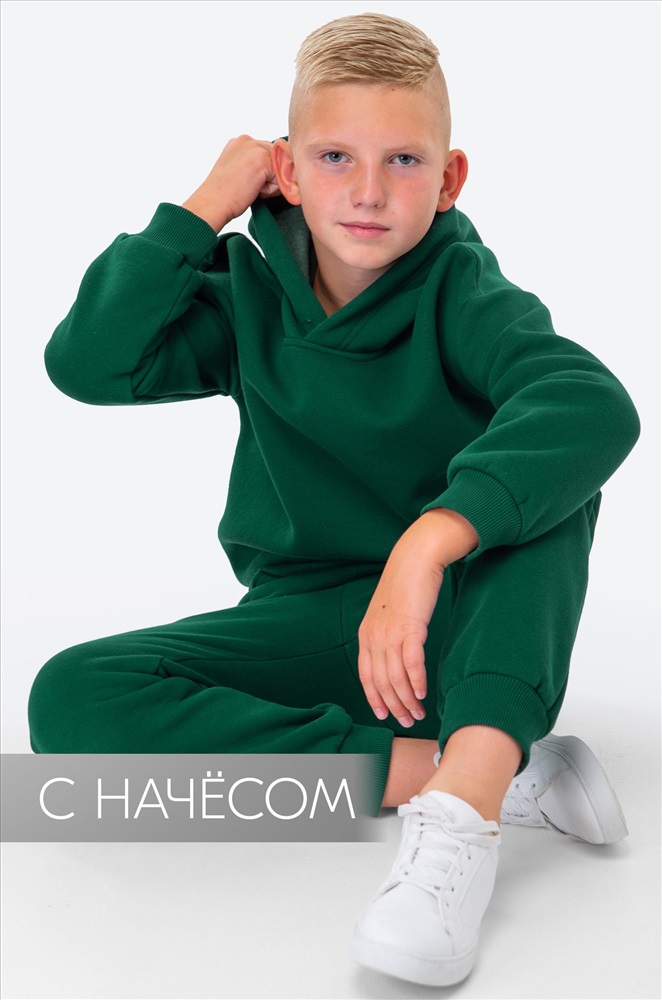 Зеленый спортивный костюм для детей выполнен из плотного трикотажа футер трехнитка. Начес отлично сохраняет тепло и не пропускает холодный воздух. Костюм хорошо тянется и держит форму даже после частых стирок.