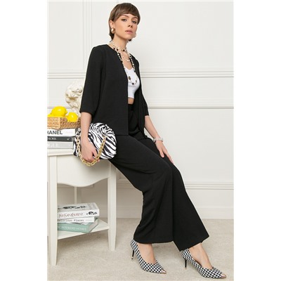 Эстетичный завтрак дома, деловой обед в жаркий полдень, расслабленный ужин в ресторане и даже свадьба – в новом костюме Каэрано из лёгкой вискозной ткани Вы везде будете чувствовать себя уютно и выглядеть великолепно! Комплект с брюками палаццо отлично смотрится на любом типе фигуры девушки, а свободный жакет прекрасно завершает образ. Черный – один из самых любимых цветов знаменитых дизайнеров. Ведь он сочетается с любыми другими цветами и оттенками, выступает отличным фоном для принтов и рисунков и прекрасно дополняет и оттеняет любой образ.
