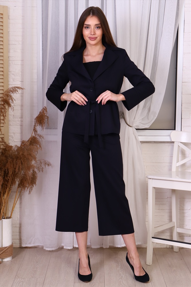 Для: Женщин Бренд: Натали Вид изделия: Комплекты женские Материал: Костюмная ткань Цвет: Черный Состав материала: вискоза-60%; полиэстер-35%; эластан-5% Код товара: НФ-00056167 Костюм из легкой ткани с прямыми укороченными брюками пользуется большой популярностью среди женщин любого возраста. Прямой крой брюк подчеркнет достоинства и скроет возможные недостатки. Жакет с лацканами выполнен без подкладки, что позволит ему более мягко сесть по фигуре, а поясок подчеркнет талию. Комментарии к товару