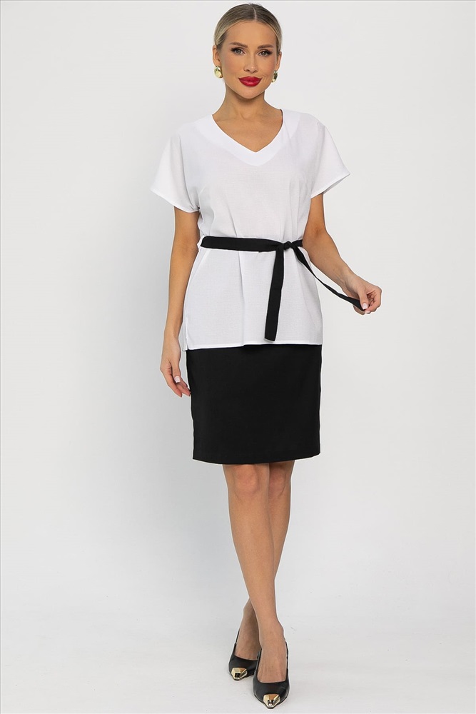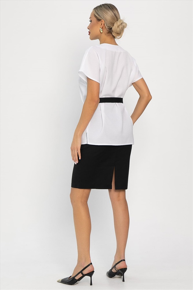 Женский юбочный костюм в бело-черной гамме, состоящий из блузы и юбки, создан для создания элегантных и удобных образов.