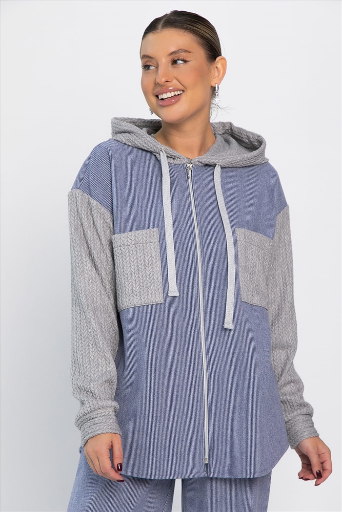 Костюм из плотной ткани в модную узкую полоску. Рубашка на молнии, с длинным рукавом, накладными карманами и капюшоном из объемного трикотажа. Брюки из объемного трикотажа на резинке по талии, широкие. Костюм прекрасно подходит для повседневного многослойного образа. Сочетая в себе комфорт и уют, костюм создает новый тренд в одежде и свежий альтернативный вариант для гардероба.