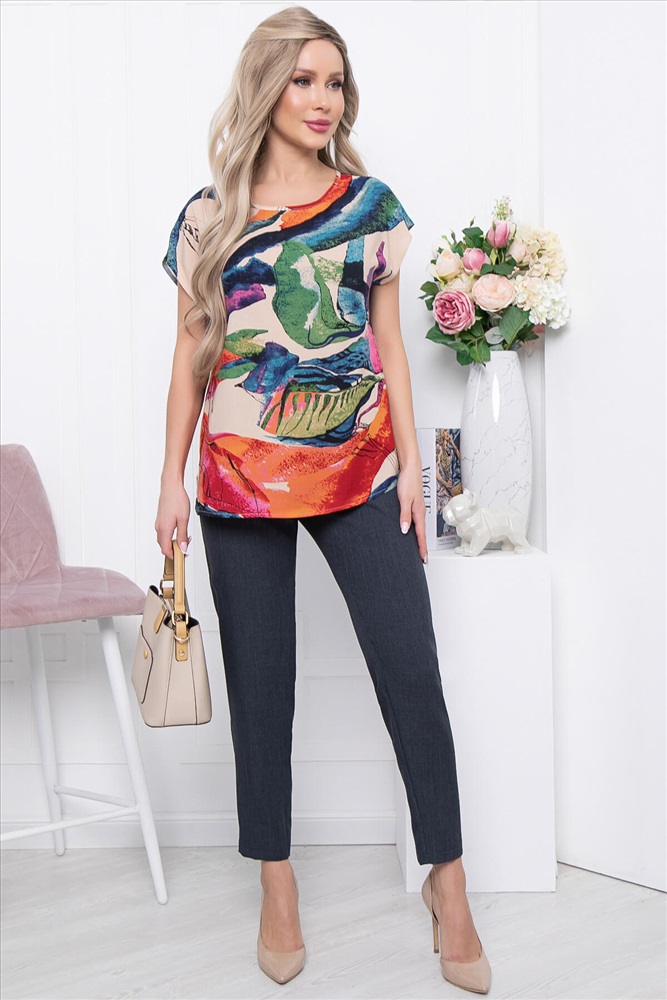 Брючный костюм - это идеальный образ на любой случай. Он прекрасно впишется в Ваш гардероб. Женственная блуза свободного кроя с вырезом лодочка отлично смотрится даже без украшений. По бокам есть разрезы. Брюки классические, талия на резинке.